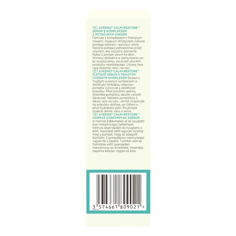 Aveeno® Calm+Restore™ Pleťové sérum obsahuje Trojitý ovsený komplex (koloidná ovsená múka, výťažok z ovsa a ovsený olej), ktorý upokojuje a regeneruje pleť a obnovuje kožnú bariéru, a upokojujúcu rimbabu, známu svojimi antioxidačnými vlastnosťami a upokojujúcim účinkom na pokožku.