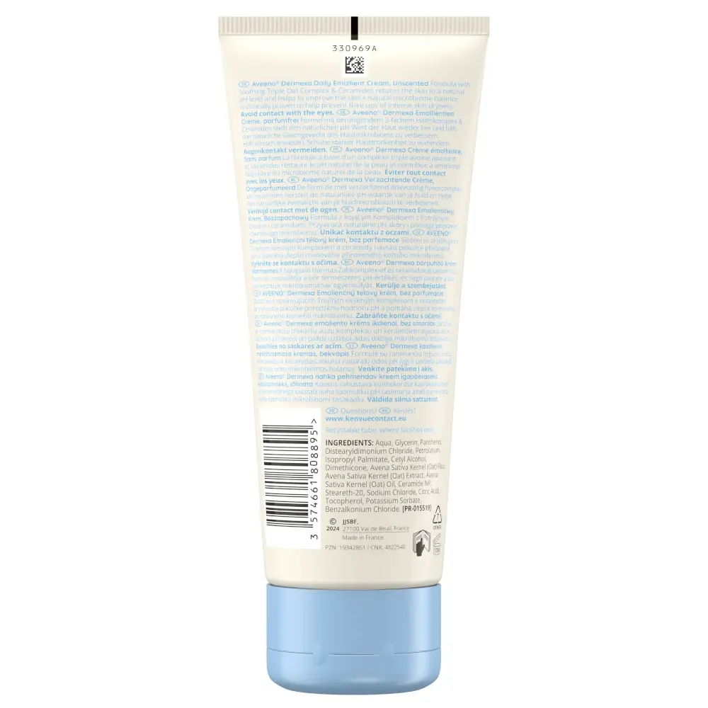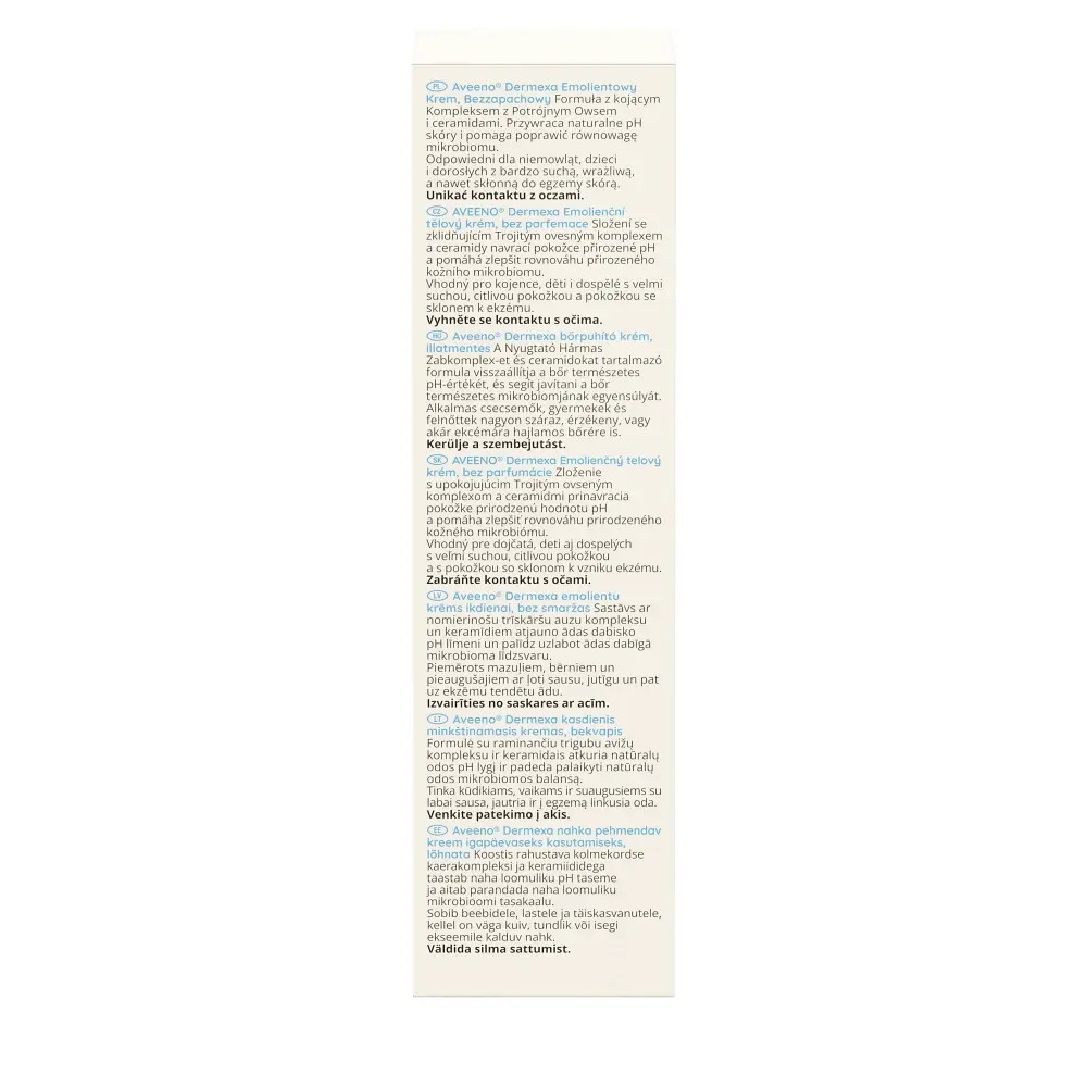 Aveeno® Dermexa Emolienčný telový krém má nemastné, vegánske* zloženie, ktoré kombinuje upokojujúci Trojitý ovsený komplex s ceramidmi. Krém pomáha upokojovať a chrániť veľmi suchú a svrbiacu pokožku. Zároveň posilňuje prirodzenú kožnú bariéru. Aveeno® Dermexa Emolienčný telový krém pokožku hydratuje a dodáva jej okamžitý pocit komfortu. Je vhodný aj na pokožku so sklonom k ekzému. Pomáha posilňovať kožnú bariéru a zlepšovať prirodzenú rovnováhu kožného mikrobiómu pre zdravý a pružný vzhľad pokožky.